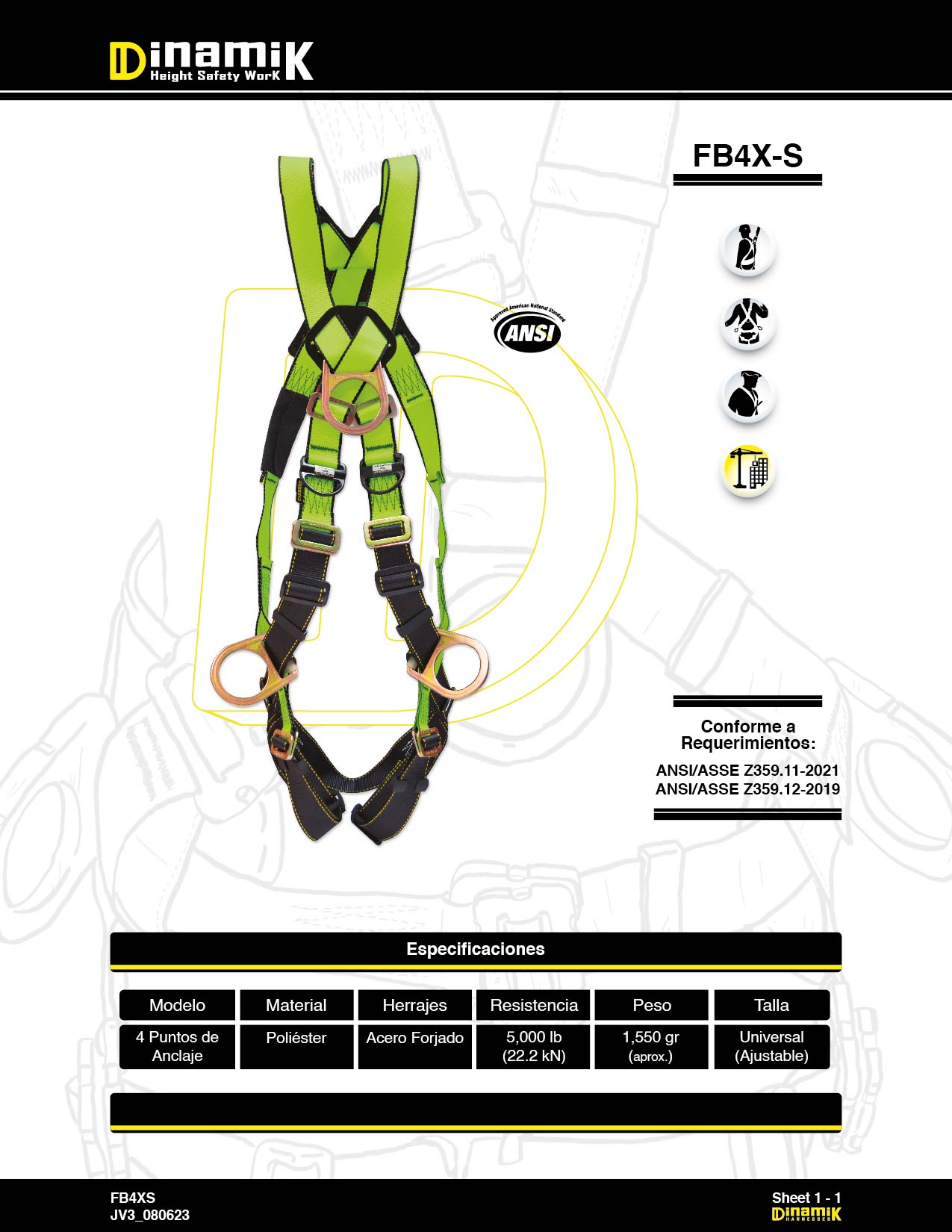 Arnés Cuerpo Completo tipo “X” con cuatro puntos de anclaje; fabricado en reata poliéster de alta tenacidad con una resistencia a la tracción superior a los 5,000 lbf y completamente regulable. Hebillas de ajuste rápido en acero estampado y/o forjadas y argollas en acero forjado con una resistencia a la tracción mínima de 5,000 lbf.
